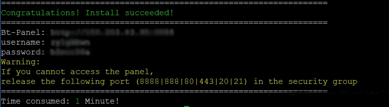 ①使用ssh,登录服务器,命令行输入:yum install -y wget && wget -O install.sh http://download.bt.cn/install/install_6.0.sh && sh install.sh等待安装成功,并记录宝塔面板的登录地址及密码。(期间会提示是否安装,输入Y,回车)