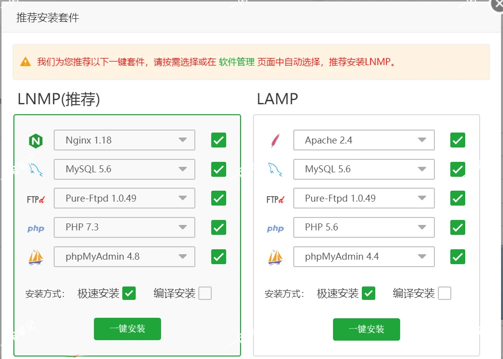 ③一键安装推荐套件:LNMP网站环境是Linux+Nginx+Mysql+PHP的组合搭配网站程序环境,用来快速搭建各种开源的网站程序(WordPress,帝国CMS,织梦,Zblog等)