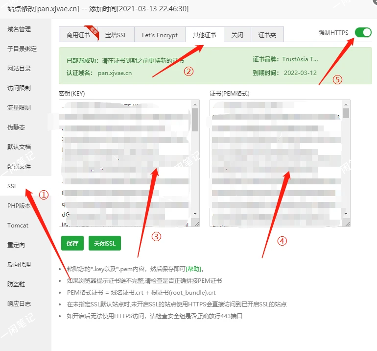 ④新建站点,强制开启ssl:ssl证书在购买.com/.cn等**域名的时候会赠送个免费的ssl,具体看服务商。如果没有,可以去腾讯云dnspod上免费申请。证书在nginx文件夹下。或是直接申请宝塔的ssl。