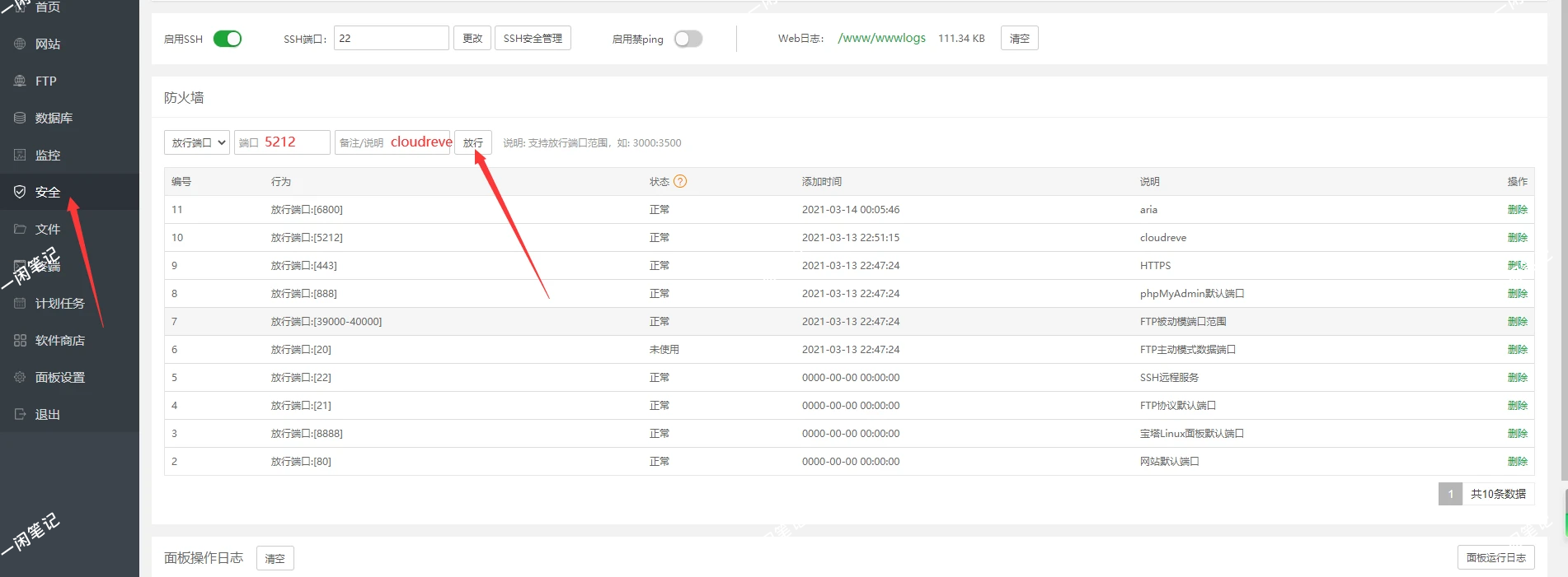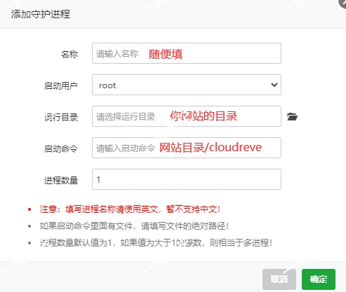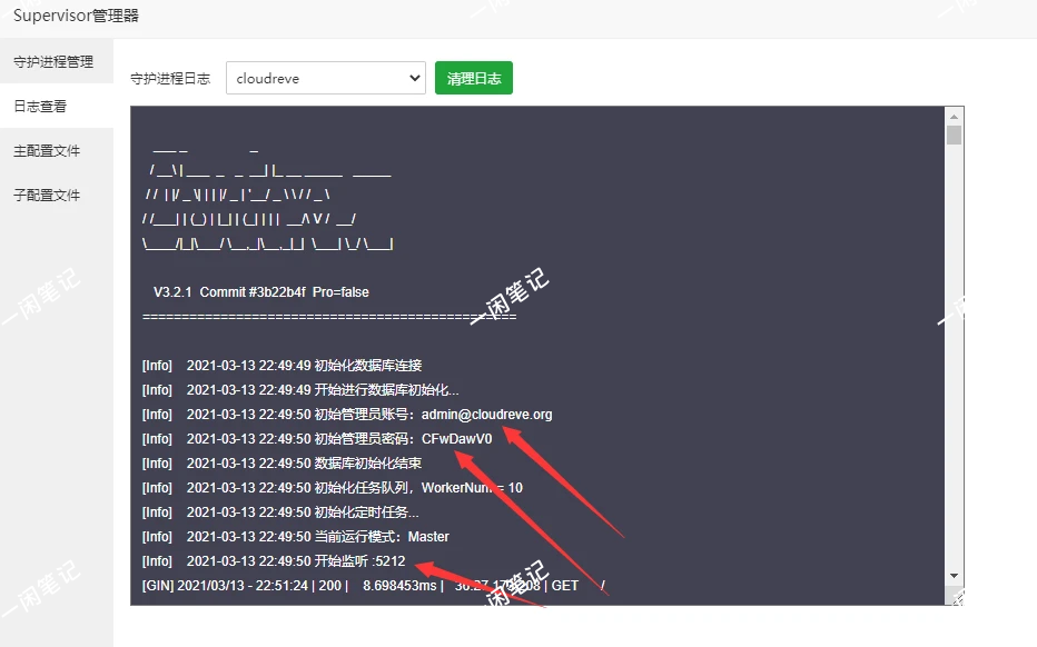 ⑤安装cloudreve:进官网下载http://cloudreve.org/,用宝塔面板上传到网站根目录并解压。进软件商店,安装Supervisor管理器 2.2。添加守护进程,如下图。启动进程,在日志查看里找到并记录cloudreve的管理员账号密码。在安全界面的防火墙里面,放行5212端口,并在自己的服务器端放行5212端口。测试你的服务器http://服务器IP:5212。