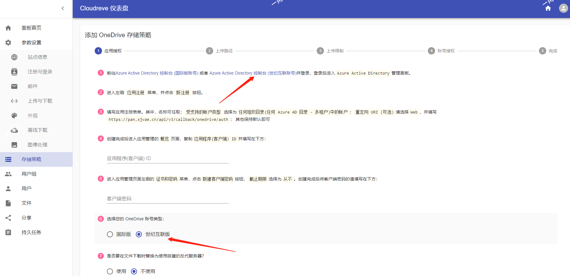 ④按照上面的提示操作,点击Azure Active Directory 控制台 (世纪互联账号),选择onedrive账号类型为世纪互联。其他内容从Azure Active Directory后台获取填写,开发者写的很详细了,这里就不细说。后面的上传路径和上传限制可直接默认。