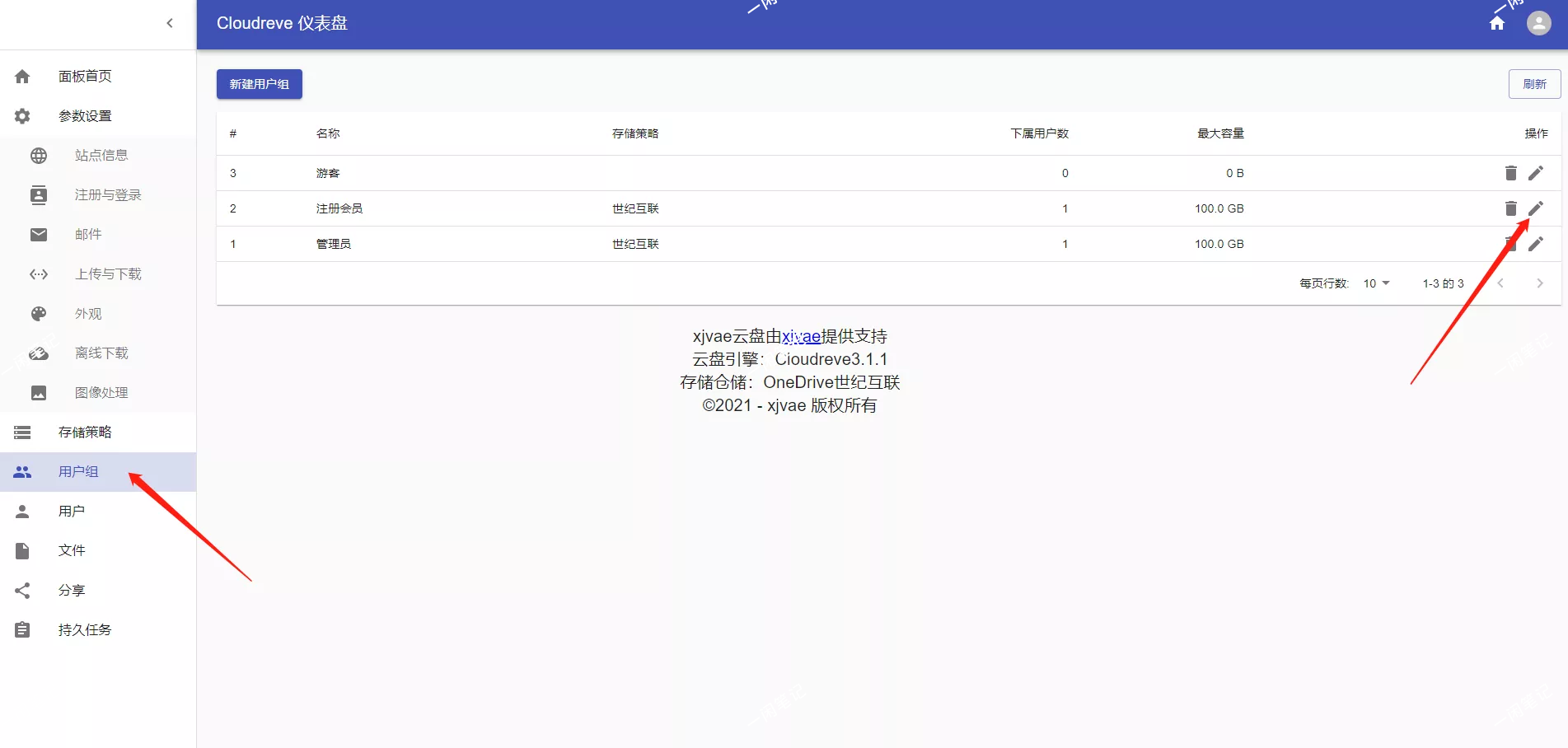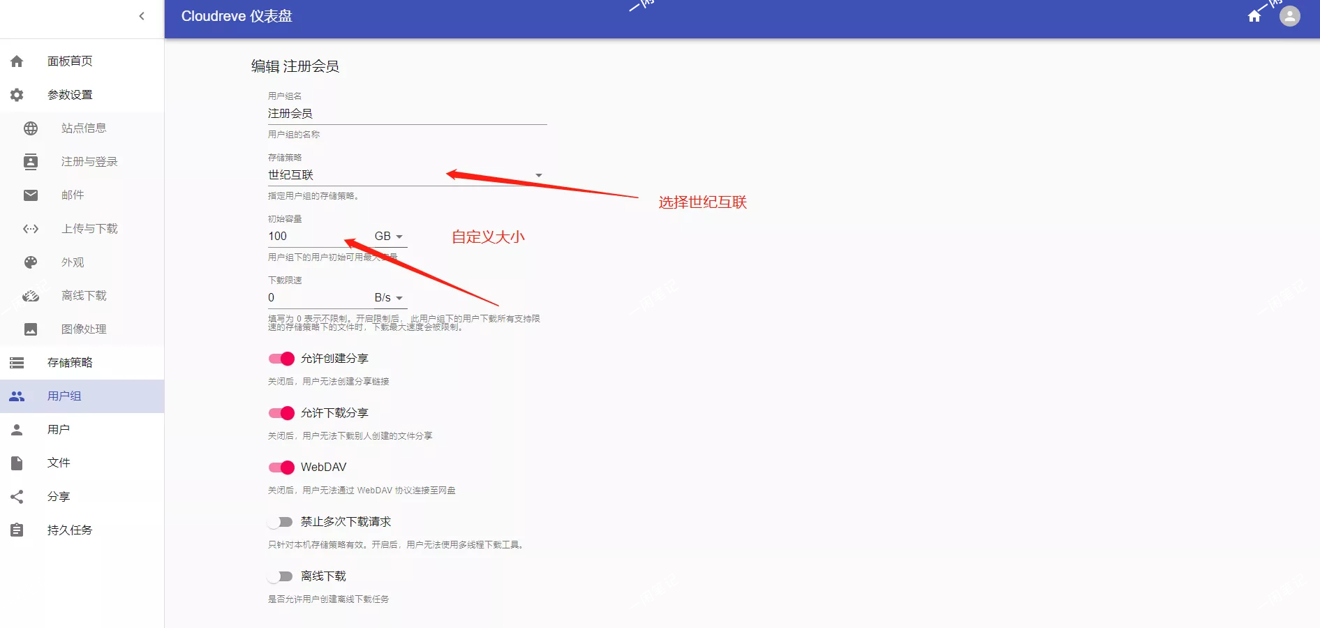 ⑤添加存储策略成功后,选择左侧用户组将所要用到的用户组编辑存储策略和容量大小。(世纪互联默认是1TB,可自己调整大小)