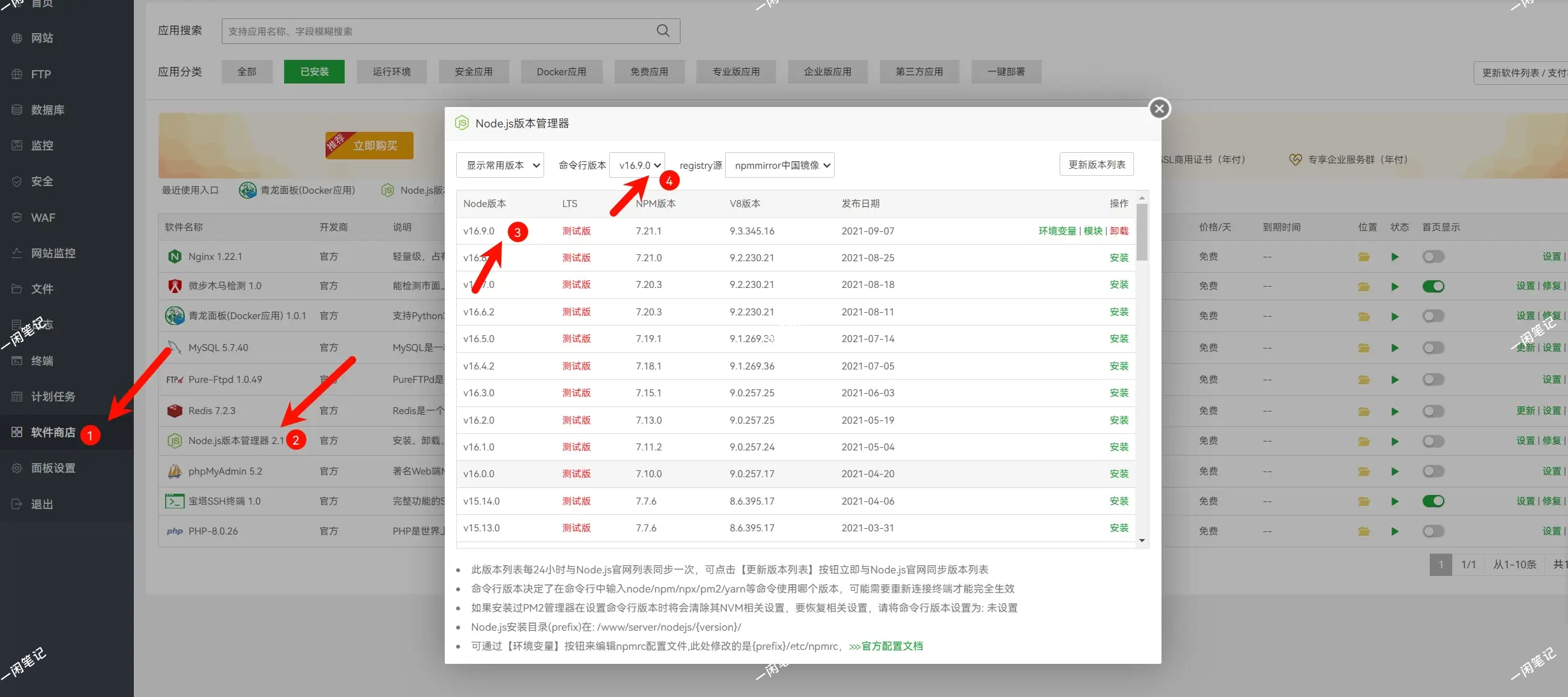 安装Node.js版本管理器:进入宝塔 -->软件商店 -->Node.js版本管理器 2.1 -->设置 -->安装v16.9.0 -->命令行版本选择v16.9.0